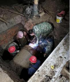 該段水泥管屬于主城區(qū)老舊管網(wǎng),管道周圍環(huán)境復雜,布有國防光纜、天然氣管道等重要設施,不能動用大型機械,只能通過人工及簡易工具開挖。時間緊,任務重,為爭取搶修時間,搶修人員一邊現(xiàn)場制訂維修方案,一邊聯(lián)系準備各種配件和維修材料。為將對用戶的影響降至最小范圍,水廠實行減壓供水,待開挖和搶修材料一切準備就緒后,搶修人員實行帶水作業(yè),先給套管預留一個DN50鋼管作為導流口,待水泥頭子徹底凝固后再關閉導流口。封堵水泥頭子時,噴涌而出的水流濕透了搶修人員的衣服,速干水泥灼傷了他們的皮膚,但他們沒有一絲退縮,仍爭分奪秒地在水坑中忙碌著搶修工作。